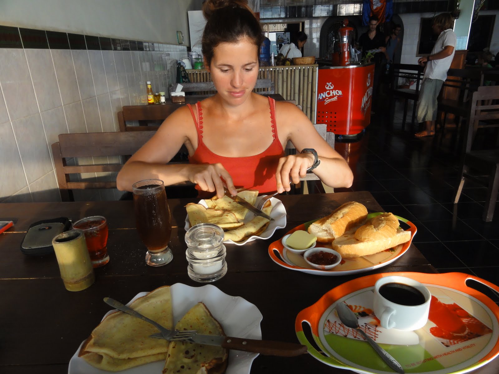 Evidemment les chics soirees s'enchainent, on a retrouve, Elise, Manu et Dimitri, nos trois kines excellents suivis a la trace depuis Kratie !! Petit dej du dernier jour, reveil super matinal pour etre sur de pas rater les dernieres supers crepes de Ludo!!! trop cool, j'en ai commande 4 rien que pour moi, fil plus sage en a commande seulement 2 avec une baguette... pfff petit joueur!
